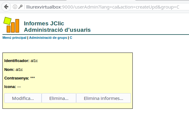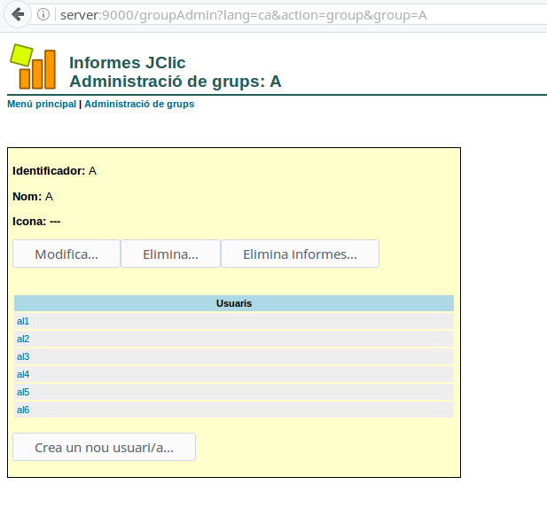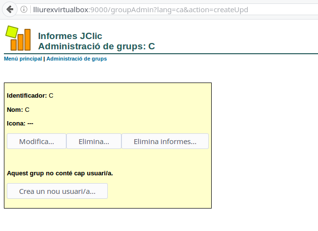 Podem fer clic a Crea un nou usuari per a afegir-lo. Si volem afegir-ne més hem de tornar a Administració de grups i fer clic al grup al qual volem afegir un nou usuari: