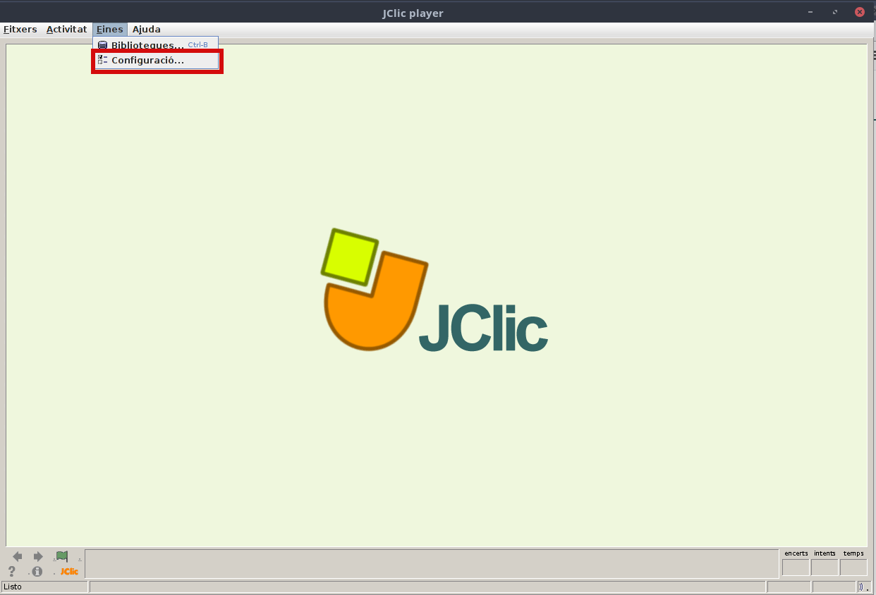 Una vegada tenim el servidor funcionant al nostre servidor d'aula i els usuaris configurats, hem de configurar el JClic perquè accepte els usuaris creats; així doncs, iniciem el JClic i anem a Eines > Configuració.