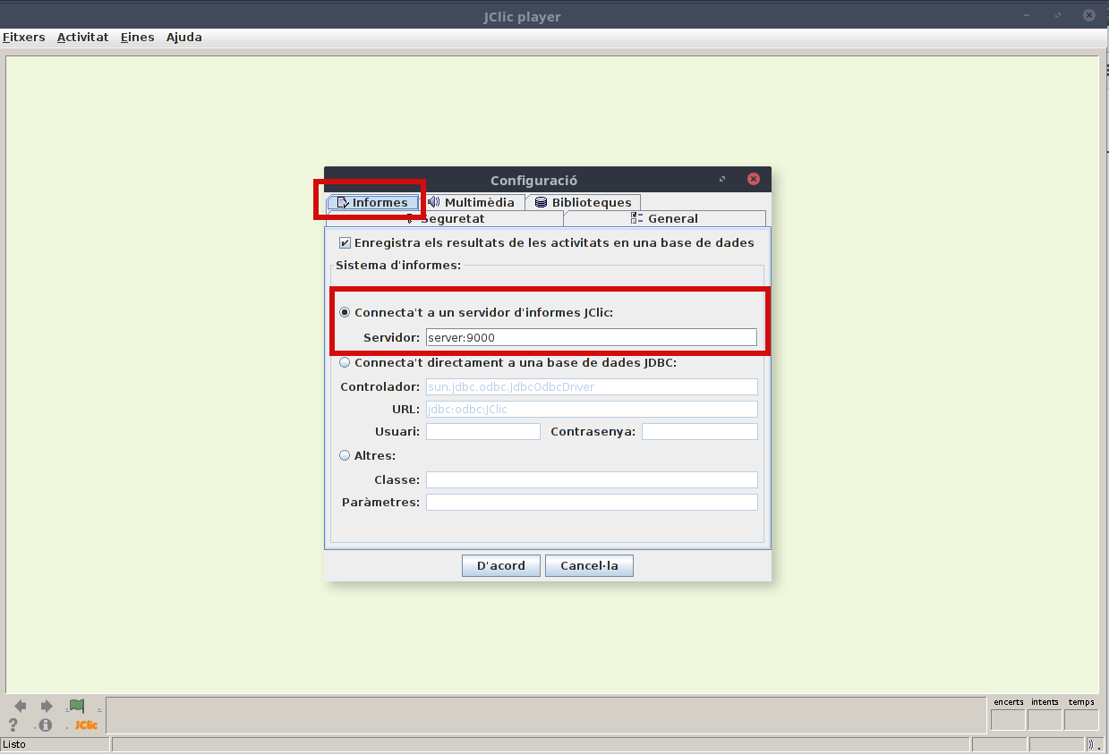 Després fem clic a la pestanya Informes i seleccionem l'opció de connectar-se a un servidor d'informes JClic. Hem de fixar-nos que tenim l'opció server:9000 seleccionada. Server és el nom del nostre servidor i 9000 és el port del JClic report.