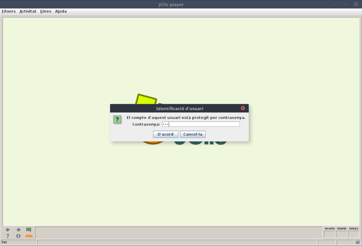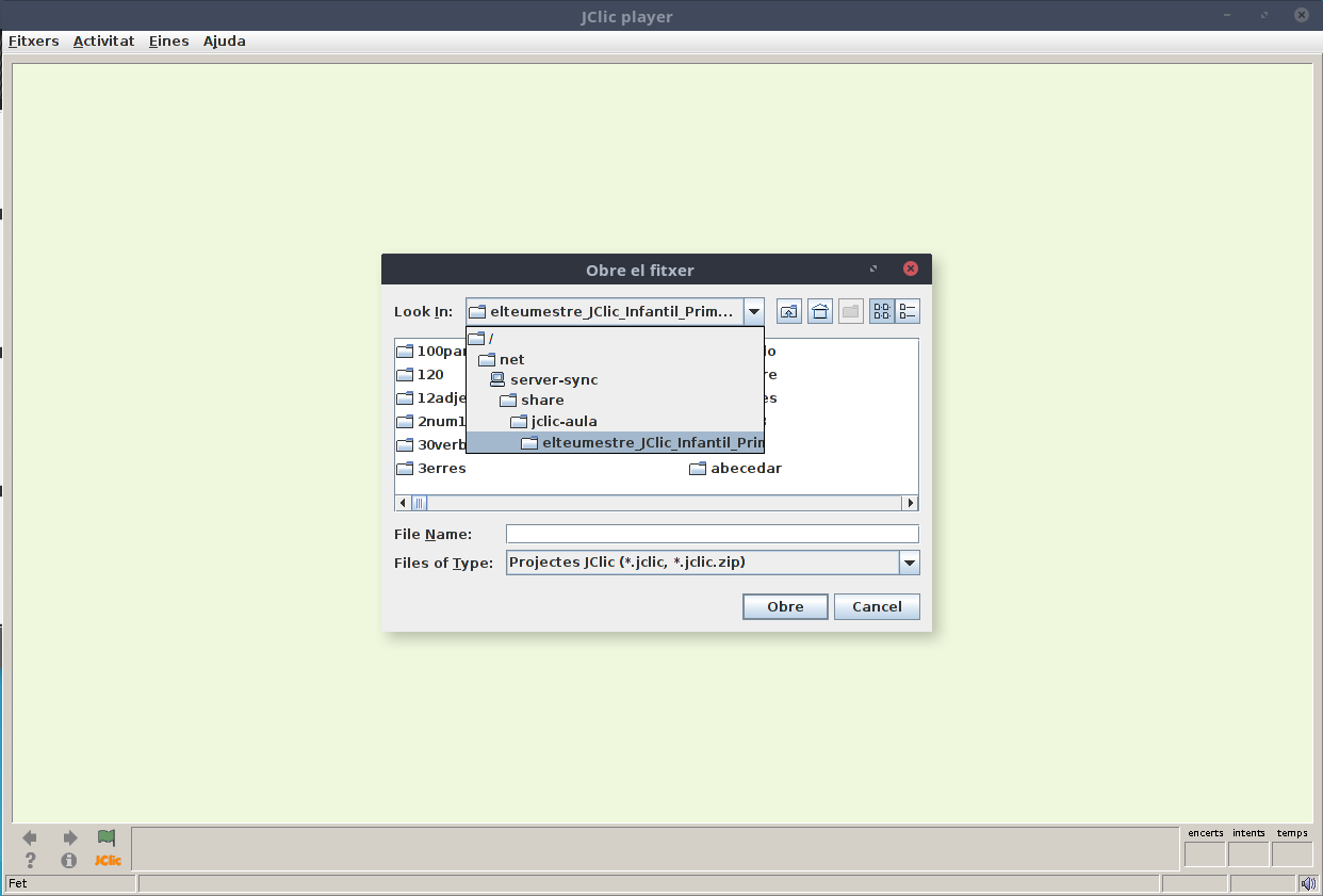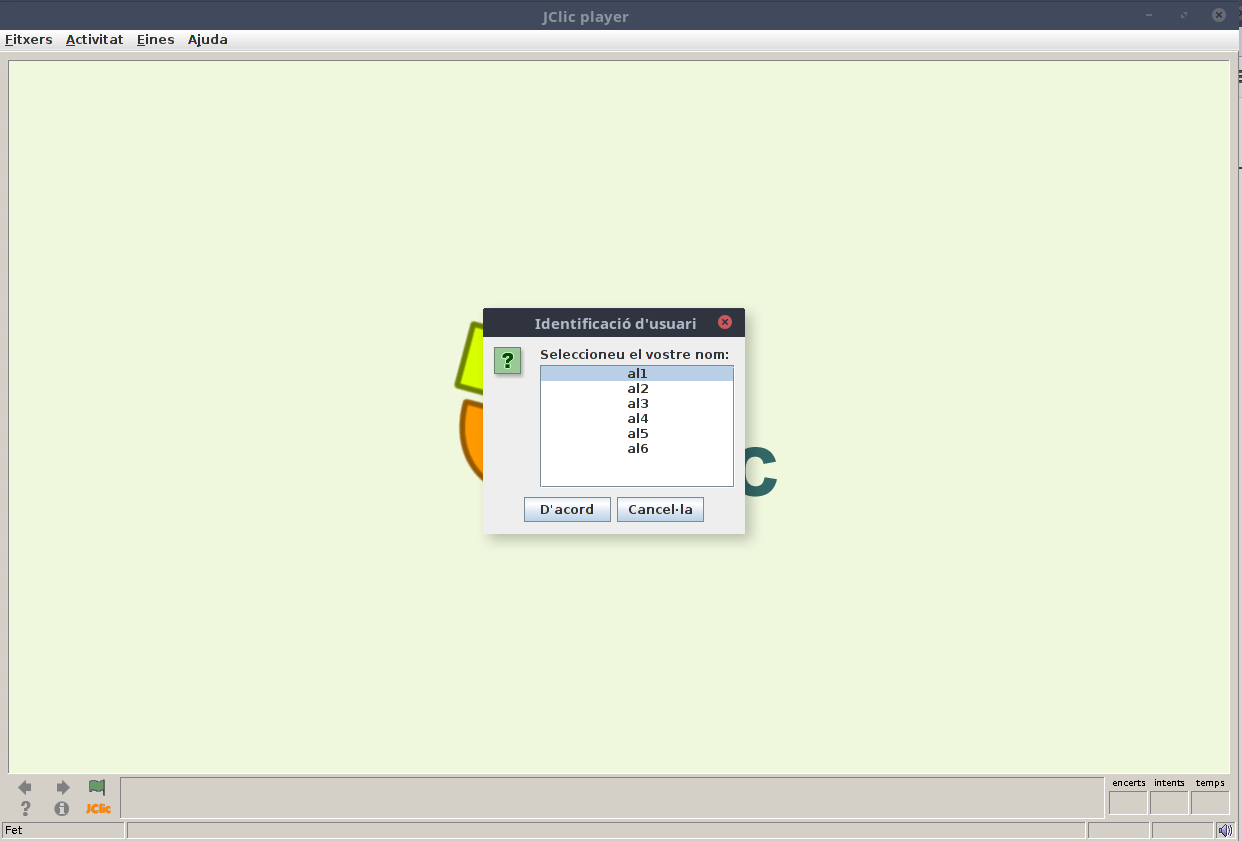 Ja sols queda iniciar qualsevol activitat amb el JClic i resoldre-la. Recordeu que els Recursos del JClic s'instal·len en /net/server-sync/share/jclic-aula/