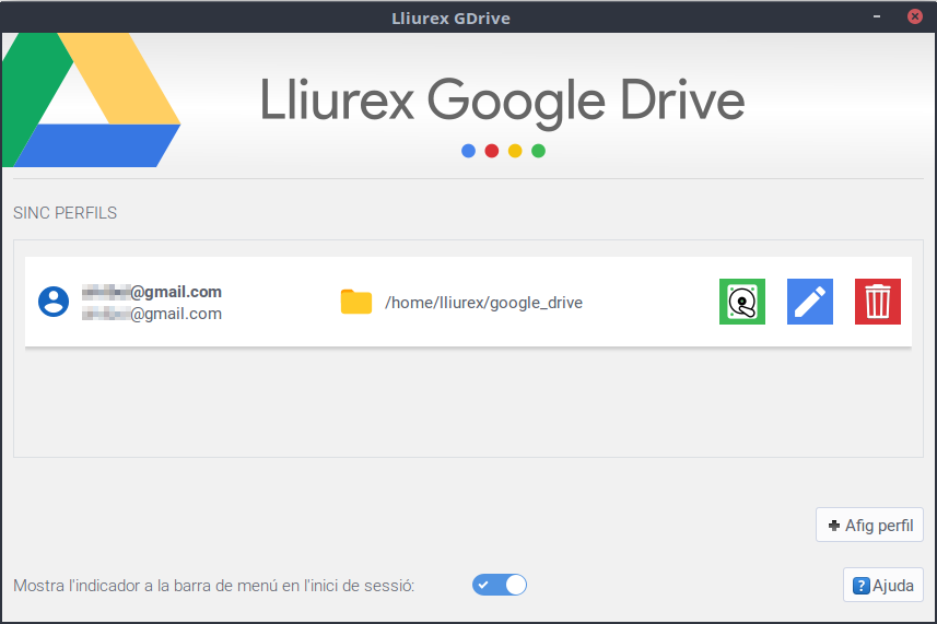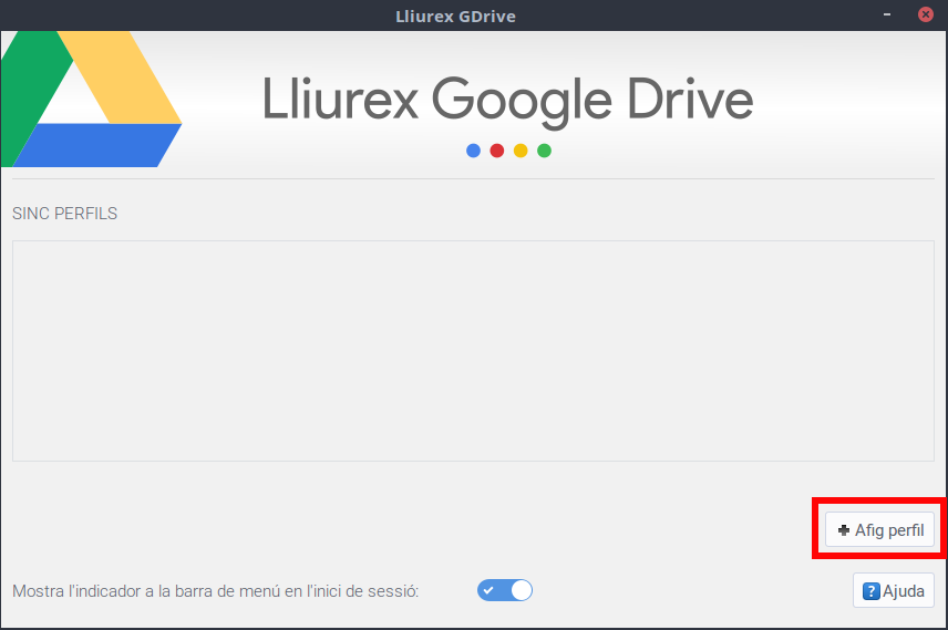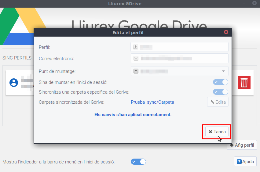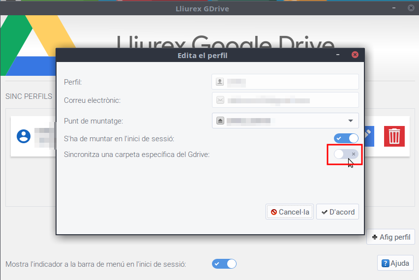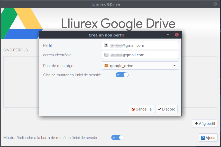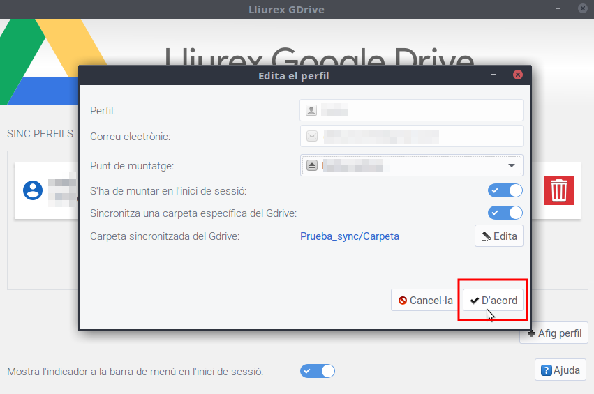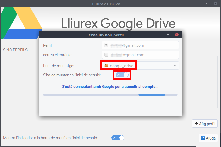 És NECESSARI crear una carpeta en la qual es muntarà la carpeta (per exemple google_drive), també podem decidir que es munte a l'inici de la nostra sessió. Llavors fem clic a D'acord i començarà la sincronització amb Google.