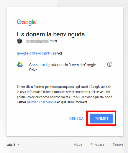 Llavors s'obrirà la finestra del navegador, i haurem d'autoritzar l'aplicació perquè puga llegir els continguts del Google Drive: