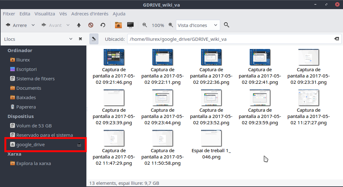 | Obri la carpeta | Amb aquesta opció, obrim la carpeta en què està muntat el Google Drive. |