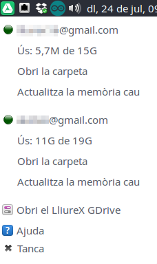 En la barra de notificacions ens apareixerà una icona del LliureX GDrive. Si hi fem clic damunt ens apareixerà un menú en què podrem veure l'estat del nostre compte. Tenim les opcions següents: