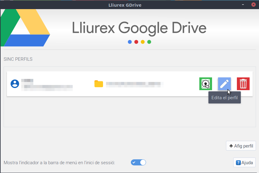 Per a especificar la carpeta que s'ha de sincronitzar, en primer lloc, accedim al LliureX Drive i editem el perfil per al qual volem especificar la carpeta.
