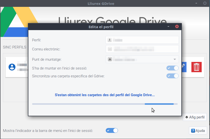 En activar l'opció, s'executarà un procés de cerca de les carpetes existents en el compte del Google Drive que estem editant.