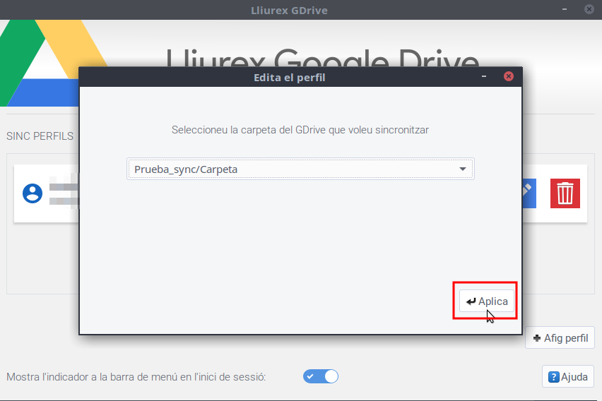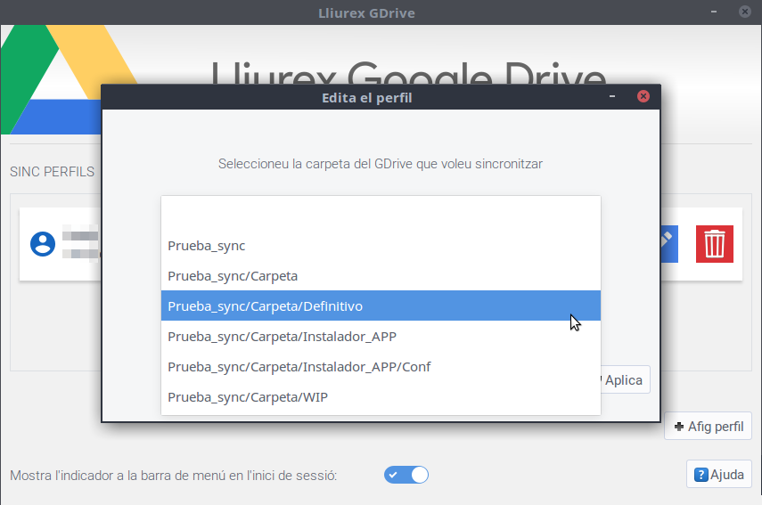 Per a canviar la carpeta el contingut de la qual tenim sincronitzat, simplement hem d'editar el perfil corresponent i, una vegada dins del formulari d'edició, polsar el botó Edita per a accedir a la llista de carpetes del perfil. De la mateixa manera, si volem tornar a sincronitzar tot el contingut del compte del Google Drive, únicament cal desactivar l'opció Sincronitza una carpeta específica del Gdrive.