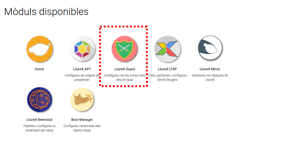 Per a configurar el LliureX Guard en LliureX 16 hi ha que anar al Centre d'Administració de LliureX 16, i així accedim a la icona de LliureX Guard en la pàgina d'inici.