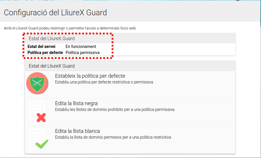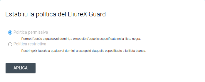 Tenim dos polítiques per defecte en LliureX Guard, si accedim a "polítiques per defecte" podem seleccionar qualsevol de les dos opcions disponibles: