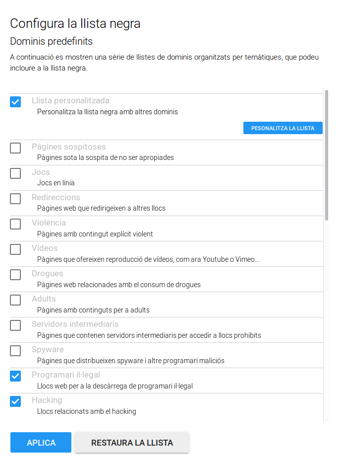 | Llista personalitzada | Personalitza la llista negra amb altres dominis |