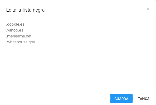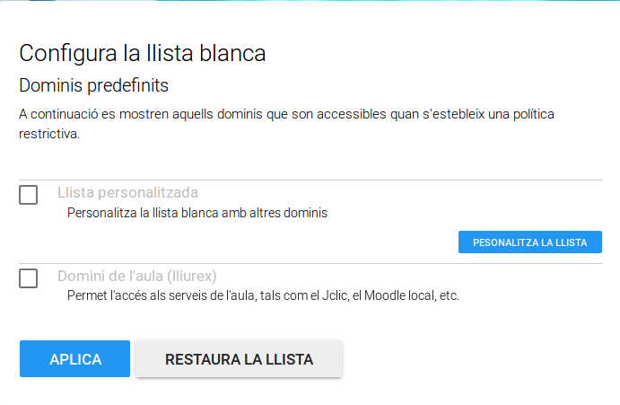 Si personalitzem la Llista Blanca, ens permetrà accedir a tots els dominis que disposem a la Llista Blanca i cap més. Aquesta opció és interessant quan volem que els alumnes treballen solament amb una sèrie de pàgines donades i no vagin a cap altra, per exemple quam exàmens online.