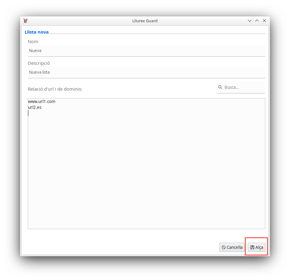- Relació d'urls i dominis: per a introduir la llista d'urls i dominis que es desitja filtrar. L'url introduït no ha de contindre http://o https:// ni cap caràcter especial en el seu començament (.,-,*,#...).