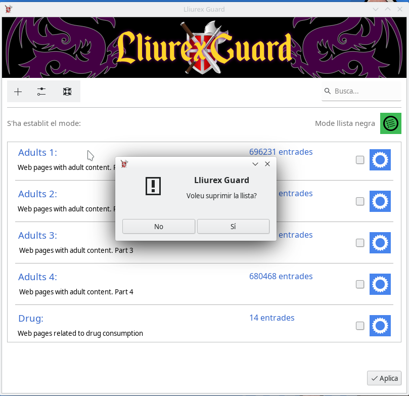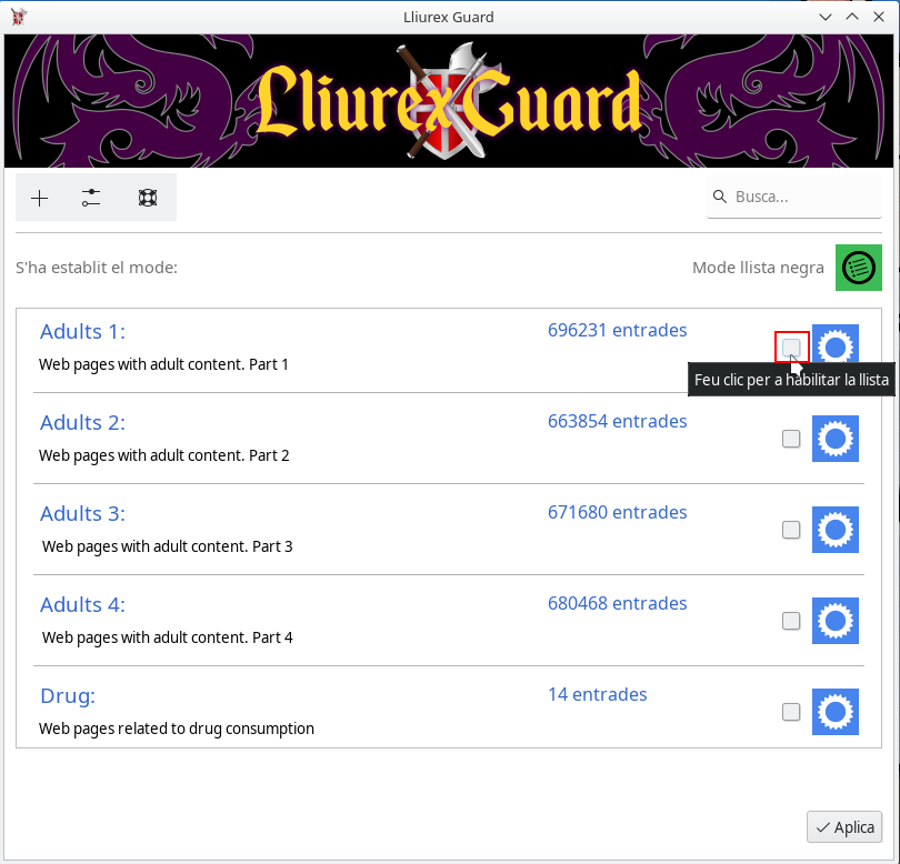 Per tal que el canvi d'estat de les llistes s'aplique, cal fer clic en “Aplica”.