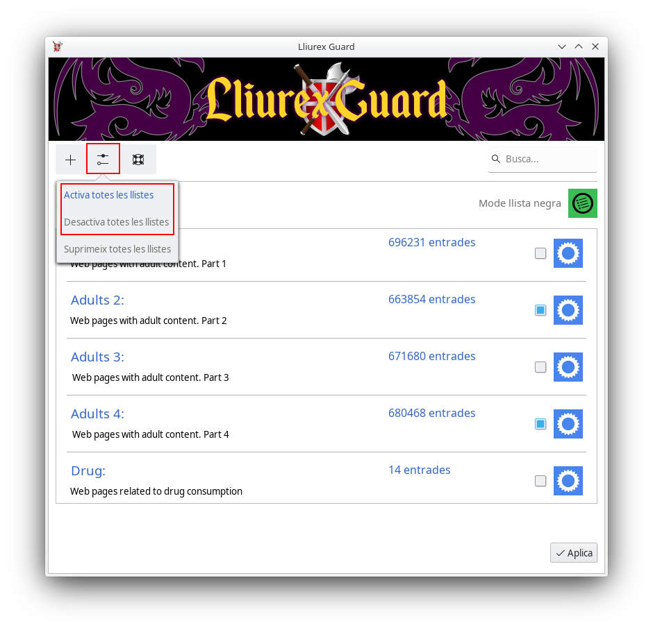 Si es desitja canviar l'estat de totes les llistes (per al mode en què es trobe Lliurex Guard) caldrà fer clic damunt de l'opció que corresponga de la barra de menú.