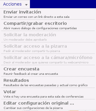 - Enviar invitación: permet l'enviament d'una invitació, per correu electrònic, a un usuari perquè puga accedir a la sala. En la invitació s'indiquen: el destinatari, el tema, un missatge, protecció amb contrasenya, període de validesa (si és procedent) i idioma.