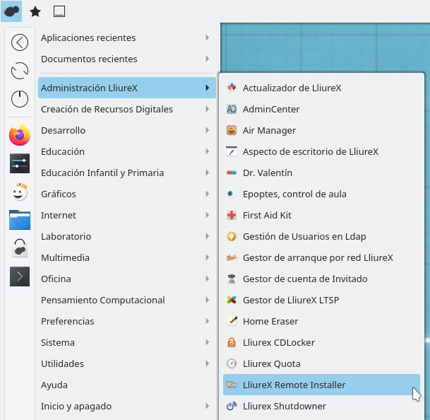 Ahora desde el menú de Aplicaciones-Admnistración LliureX iniciaremos el LliureX Remote Installer: