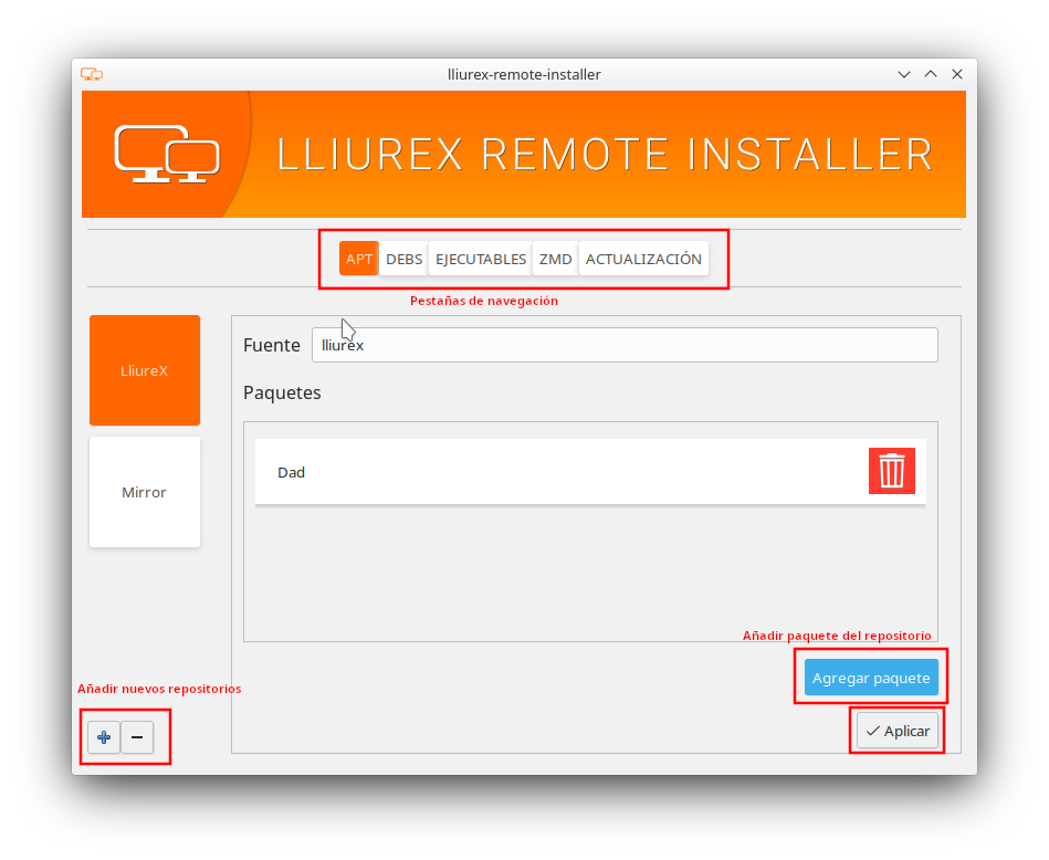Una vez tengamos añadido el repositorio, podemos ver un botón Añadir Paquete que nos servirá para añadir un nuevo paquete. El programa comprobará que el paquete está disponible en el repositorio. Si no es así, no lo añadirá. Una vez añadidos todos los paquetes necesarios se hara clic sobre Aplicar