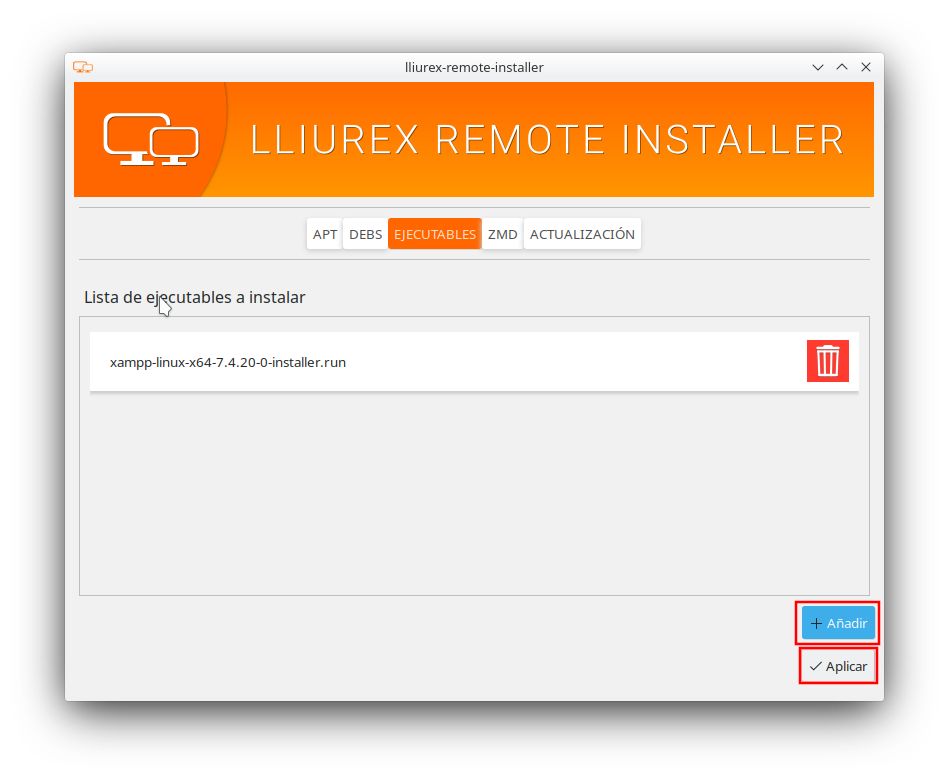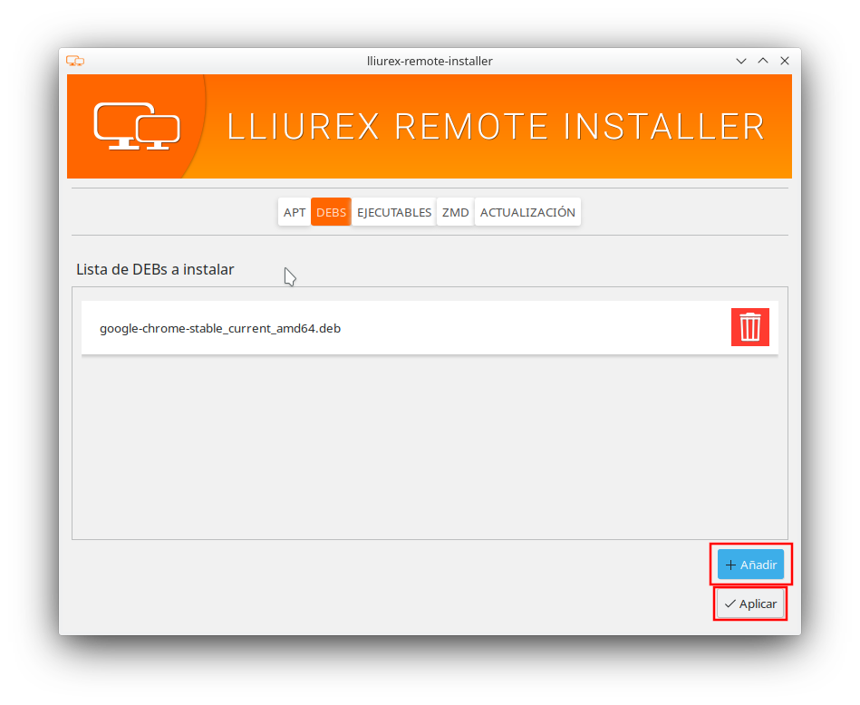 Algunos programas hoy en día vienen con un archivo ejecutable para hacer la instalación. Es por ello que si necesitamos instalar un programa con estas características el LliureX Remote Installer dispone de una pestaña para tal fin.