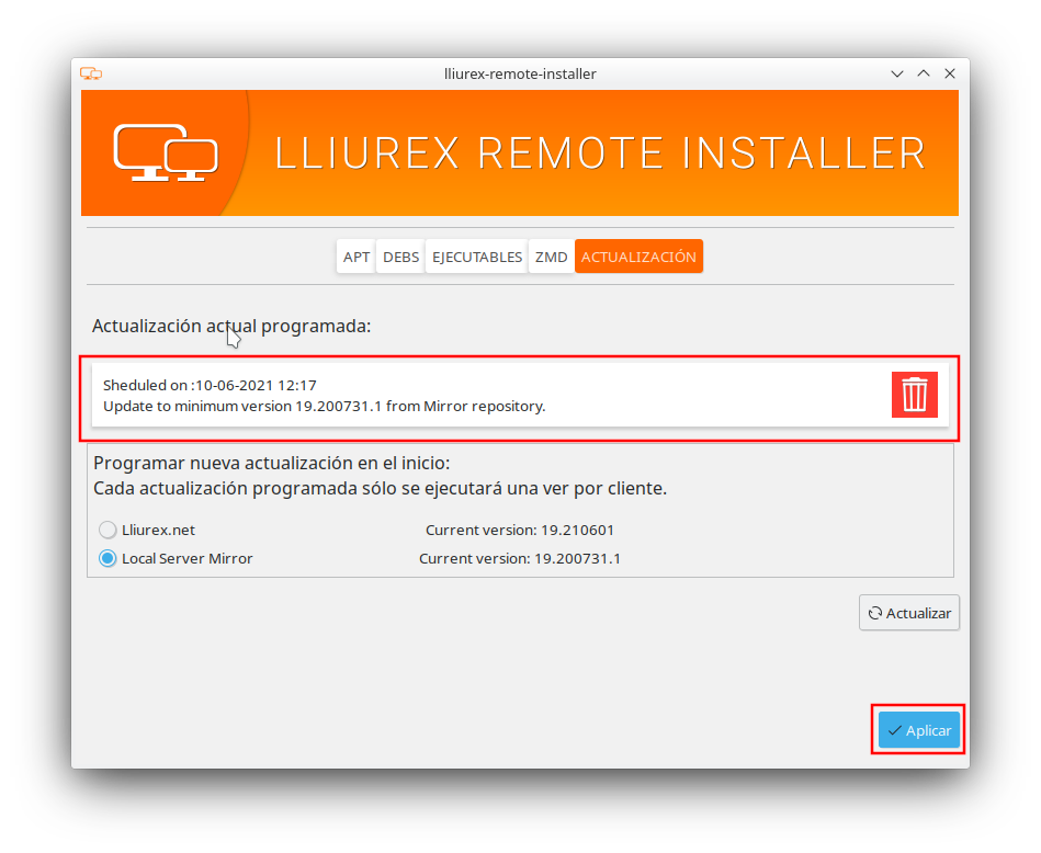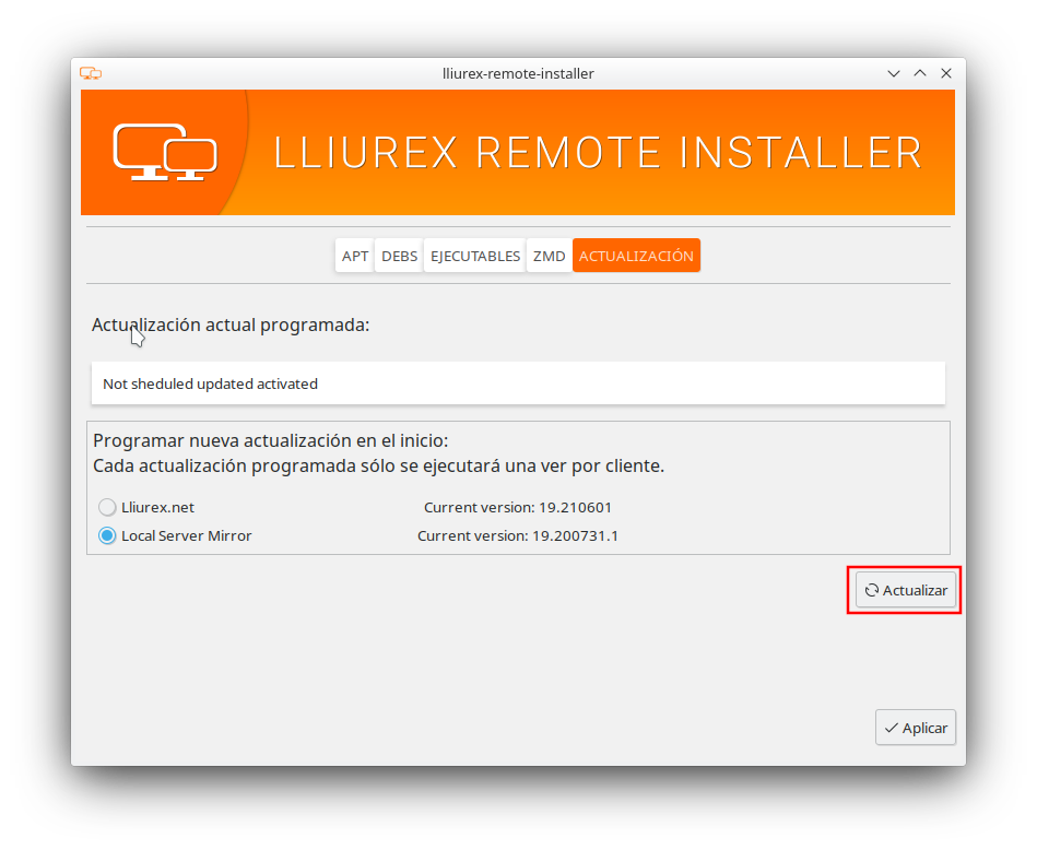 El lliureX Remote Installer también nos permite actualizar los clientes del aula sin necesidad de hacerlo directamente en cada ordenador. Es más, tenemos dos opciones de actualización: