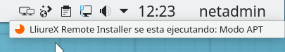 Si pulsamos sobre el indicador se mostrará información sobre el modo en que se esta ejecutando LliureX Remote Installer (APT, DEB o EJECUTABLES), junto con un "reloj" que indica su actividad.