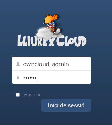 Després d'acceptar l'excepció de seguretat (pel fet que entrem amb https), es mostra una finestra on hem d'introduir un usuari i contrasenya (els de l'administrador de l'OwnCloud que hem configurat en el pas anterior), i polsar el botó Inici de sessió.
