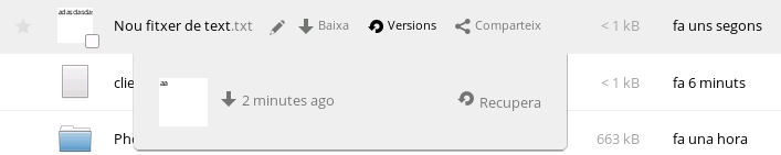 Si volem recuperar alguna de les versions anteriors, hem de polsar el botó Recupera. És important remarcar el fet que no mostra cap confirmació, per la qual cosa hem de ser cautelosos a l'hora de restaurar un fitxer.