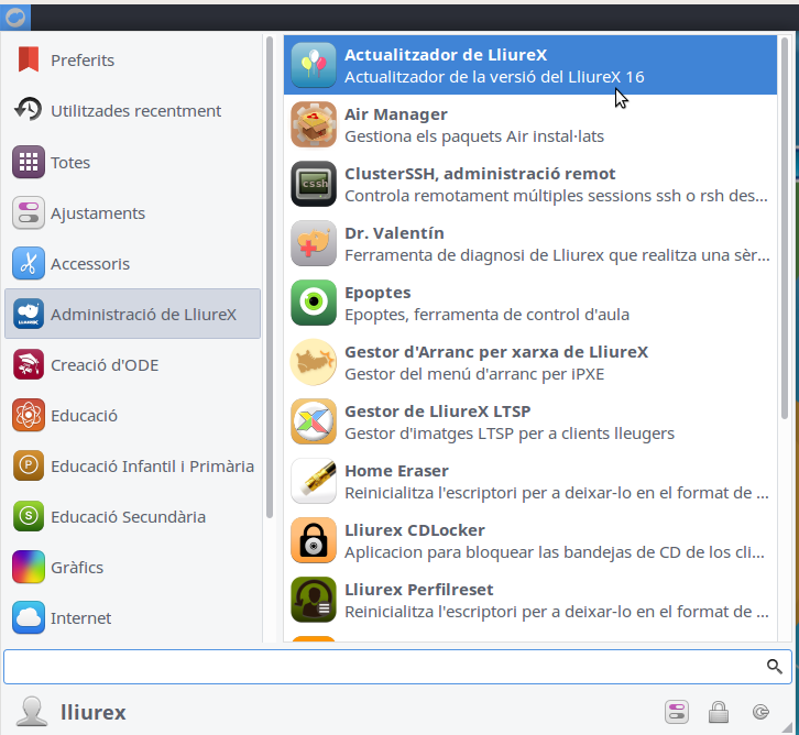 Per a executar el LliureX Up, cal anar a Inici > Administració de LliureX > Actualitzador de LliureX: