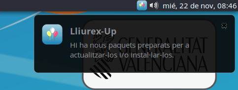 Mentre no s'execute el LliureX Up la icona continuarà visible i cada hora es mostrarà una notificació per a recordar que hi ha actualitzacions disponibles (pot ocórrer que la notificació es mostre amb més freqüència si el sistema detecta actualitzacions de la memòria cau d'apt).
