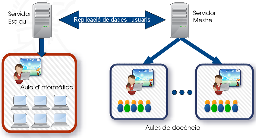 - Un servidor mestre: sol donar servei al centre (aules de docència, sala del professorat, etc.).
