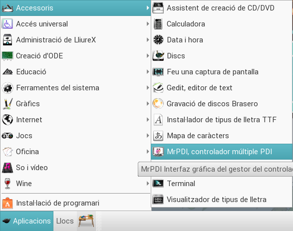 Per a començar a utilitzar Mr. PDI hem d'accedir al menú Aplicacions -> Accessoris -> MrPDI, controlador múltiple PDI. Si no es troba ací, cal revisar si està instal·lat i en cas contrari instal·lar-lo.