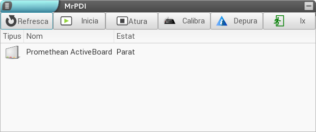 En aquest cas, s'utilitza una pissarra Promethean ActiveBoard. Com es mostra en la imatge, l'estat és Parat, és a dir, no està en funcionament. Abans de començar hem de calibrar la pissarra; per a això polsem el botó Calibra i es mostra una pantalla en blanc amb una creu roja en el cantó superior esquerre. Per a calibrar la pissarra cal anar prement, amb el llapis de la PDI o directament sobre la pissarra, totes les creus roges que van apareixent. Una vegada s'ha fet el primer calibratge, no tornarà a aparéixer aquesta pantalla.