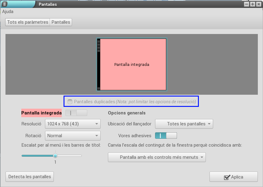Quan s'utilitza un projector amb un ordinador que ja té connectat un monitor, es dóna el problema de veure en el projector una part de l'escriptori i en el monitor una altra part. Per a solucionar-ho i poder calibrar la pissarra com correspon, hem d'obrir el menú Aplicacions -> Eines del sistema -> Preferències-> Pantalles. Una vegada fet, hem de marcar l'opció Pantalles duplicades, amb la qual cosa obtenim la mateixa imatge en ambdós.
