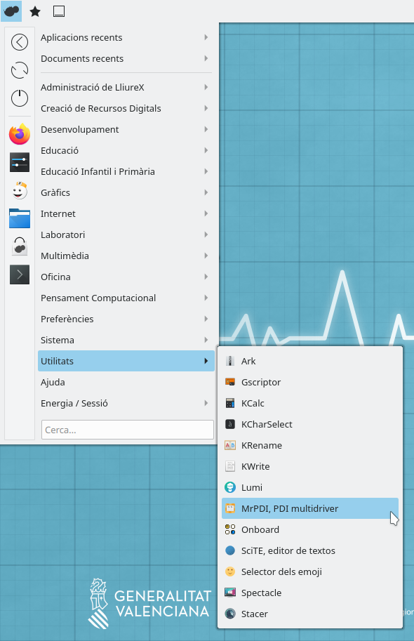 Per a començar a utilitzar Mr. PDI hem d'accedir al menú Aplicacions -> Utilitats -> MrPDI, controlador múltiple PDI. Si no es troba ací, cal revisar si està instal·lat i en cas contrari instal·lar-lo.