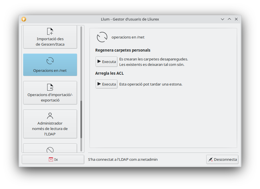 El LLUM ens ofereix una funcionalitat que permet realitzar operacions sobre les carpetes dels usuaris. Per a això polsem el botó Operacions en /net i es mostren dos botons: