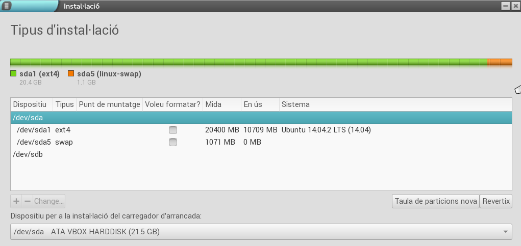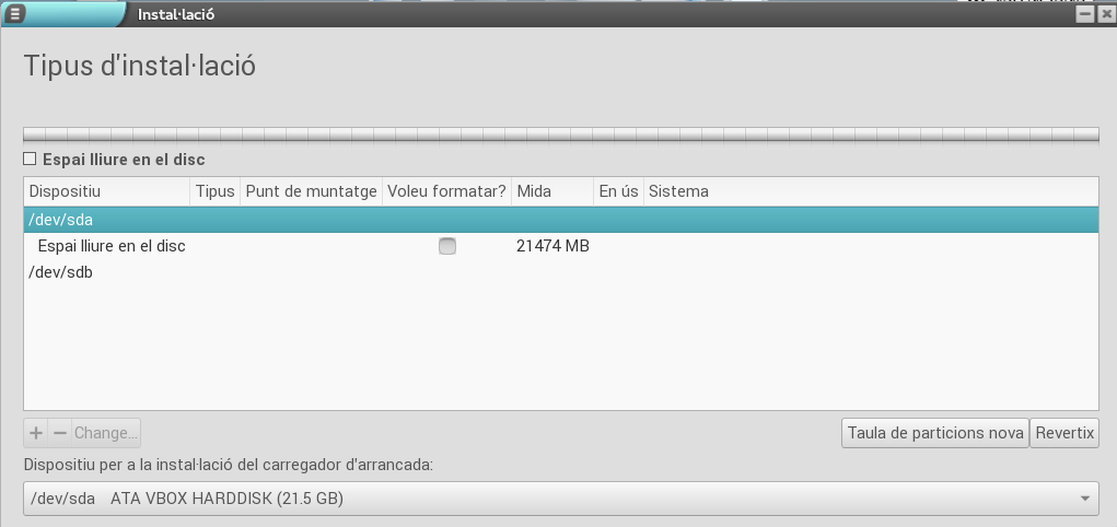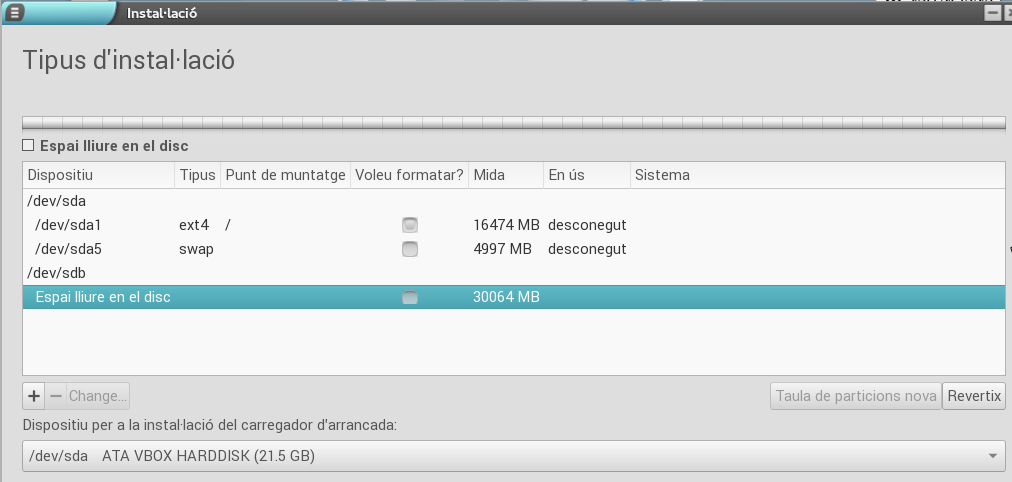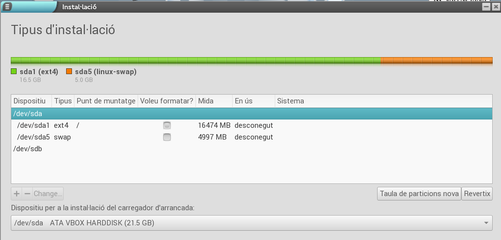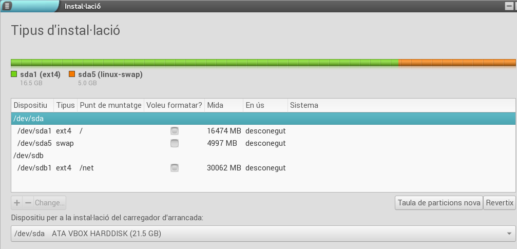 Dins d'aquest disc hem de crear dos particions: una on s'instal·larà el sistema i una altra per a l'intercanvi (swap).