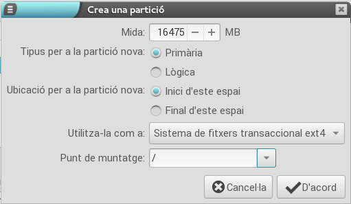 Els passos per a la creació d'aquesta partició són els següents: