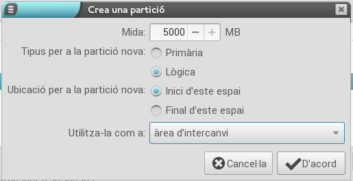 - La partició d'intercanvi serà de tipus àrea d'intercanvi i es recomana que tinga una mida equivalent a la de la memòria RAM de l'equip més un gigabyte. Per exemple, en aquest cas, com que la RAM de l'equip és de 4 GB s'ha configurat un espai d'intercanvi de 5 GB = 5120 MB.