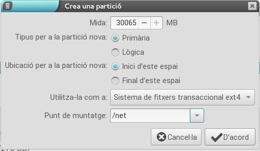 - La partició serà de tipus sistema de fitxers transaccional ext4 i es muntarà en /net d'acord amb allò que es mostra en la imatge següent i ocuparà tot l'espai del disc.