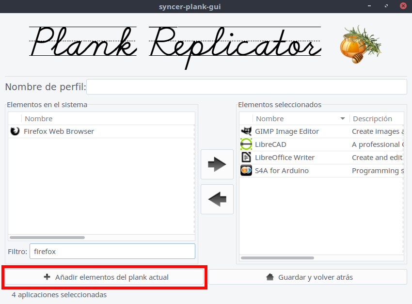 Una de las opciones más interesantes que nos encontramos en la edición/creación de perfiles es hacer una copia de los elementos que tenemos en el Plank en ese momento (solo se copian los accesos directos, no las aplicaciones que tenemos en marcha y aparecen la barra del Plank).