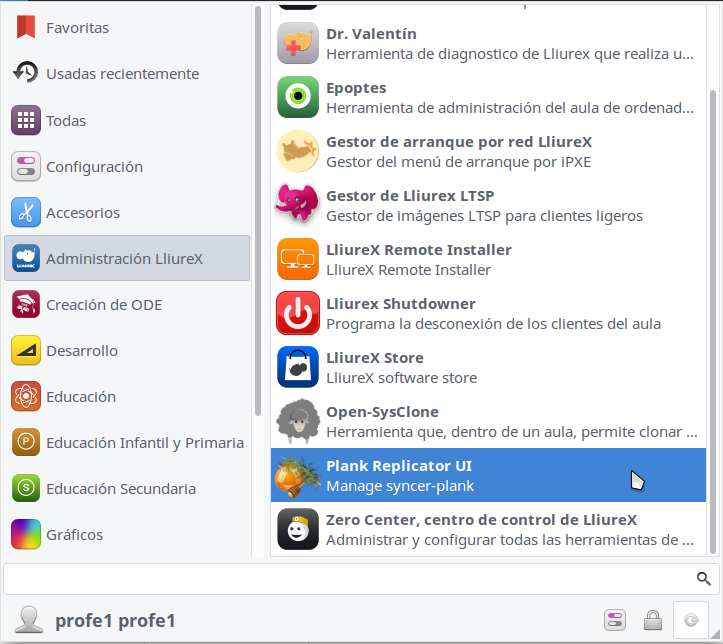 Para crear perfiles, en primer lugar hemos de loguearnos con nuestro usuario del grupo de profesores en el sistema.Para iniciar el syncer-plank vamos a Inicio > Administración de LliureX > Plank Replicator UI e iniciomos el programa: