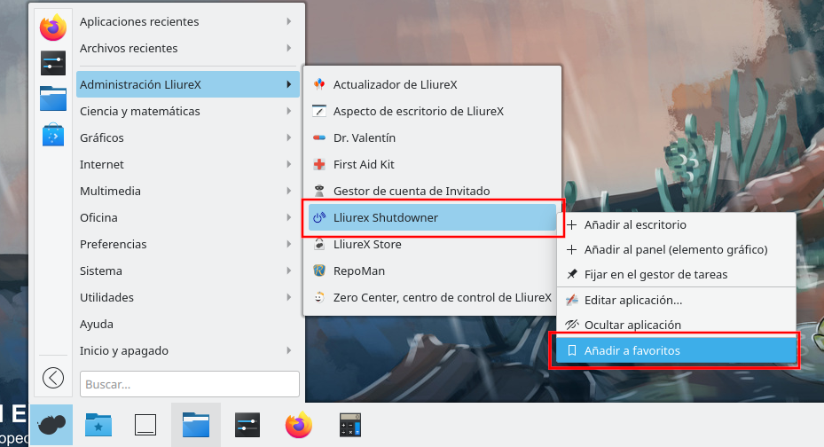Para añadir nuevas aplicaciones basta con buscar la aplicación que se desea añadir (mediante la barra de búsqueda o navegando por el menú). Una vez localizada la aplicación que se desea incluir en la zona de favoritos se hará clic sobre ella con el botón derecho del ratón y se seleccionará la opción Añadir a favoritos.