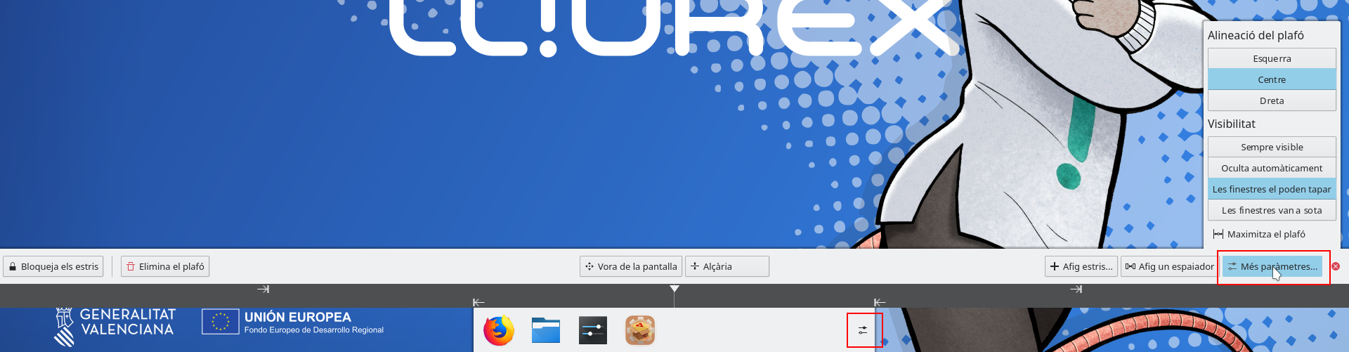 Si es fa clic amb el botó esquerre del ratolí sobre Configura el plafó és possible accedir a les opcions de personalització del gestor de tasques, per a per exemple establir la visibilitat del gestor de forma que siga sempre visible o que s'oculte automàticament després d'uns segons.