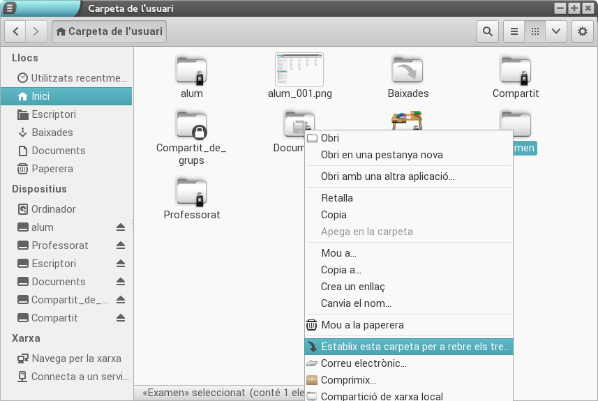 LliureX permet habilitar una carpeta del professorat per a rebre treballs de l'alumnat. Si volem marcar una carpeta per a rebre treballs, hem de fer-hi clic damunt amb el botó dret del ratolí i seleccionar l'opció Estableix aquesta carpeta per a rebre els treballs.