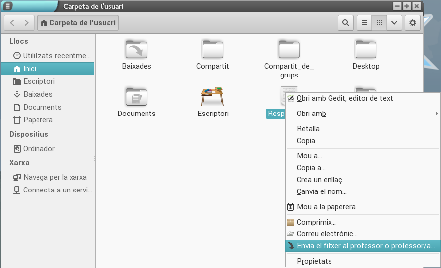 L'alumnat per a poder enviar un fitxer (només es permet enviar fitxers, no carpetes) ha de fer clic amb el botó dret en el fitxer que vol enviar i seleccionar l'opció Envia el fitxer al professor o professora....