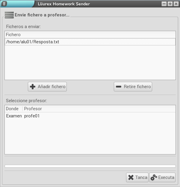 A continuació, apareix una finestra en què es poden afegir més fitxers utilitzant els botons Afig un fitxer i Retira el fitxer. Una vegada tinga tots els fitxers preparats, l'alumne o alumna ha de seleccionar en el llistat de la part inferior del programa la carpeta a què vol enviar el treball. Una vegada seleccionada, només queda fer clic a Executa.