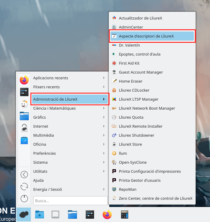Para ejecutar la aplicación hay que acceder al Menú>Administració de Lliurex>Aspect d'escriptori de LliureX.