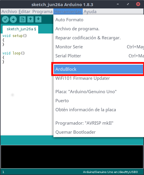 Para iniciar Ardublock debemos iniciar, en primer lugar, arduino. Una vez lo tengamos iniciado, vamos a Herramientas > Ardublock para iniciar el Ardublock: