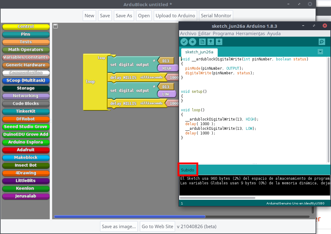 Una vez tengamos inciado Ardublock, podemos crearnos un programa de ejemplo y darle a Upload to Arduino, esto nos creará el programa traducido a C, y nos lo cargará en nuestra placa de Arduino.