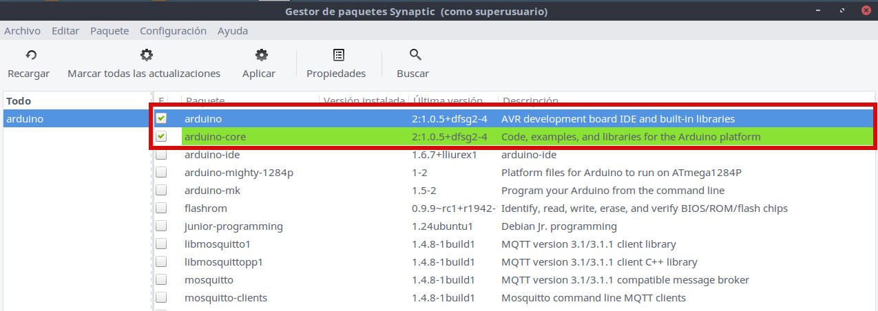Instalar la versión de los repositorios de ubuntu. Para ello, hemos de instalar el paquete Arduino y Arduino-core, dentro de este paquete ya está incluido el IDE Arduino que aunque veamos como un paquete diferente llamado Arduino IDE, NO hace falta instalarlo. Podemos instalarlo desde synaptic:
