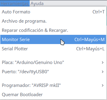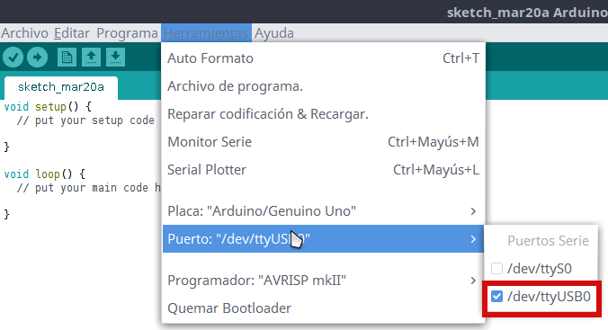 Luego en Herramientas > Puerto le indicamos qué USB vamos a utilizar:
